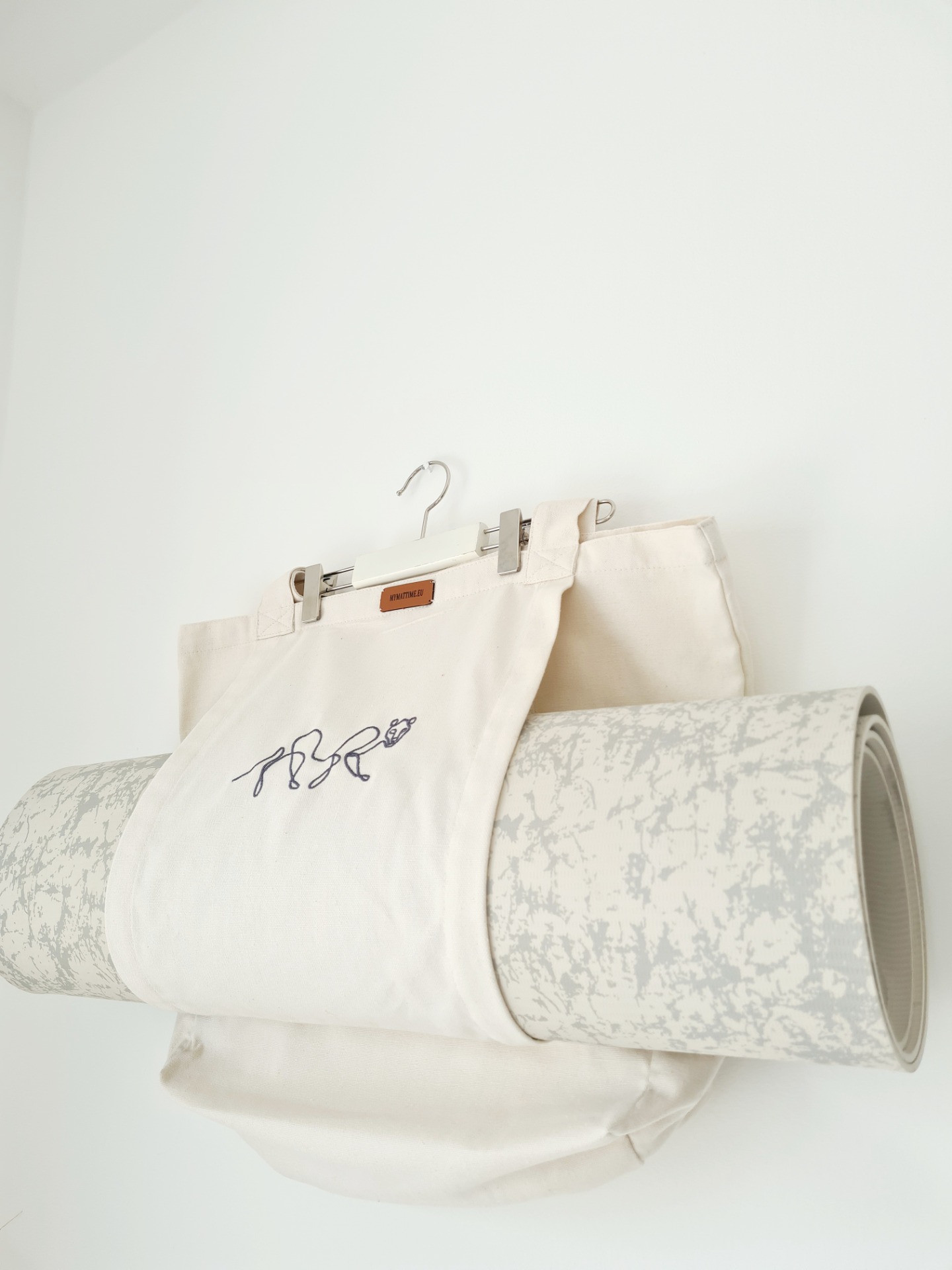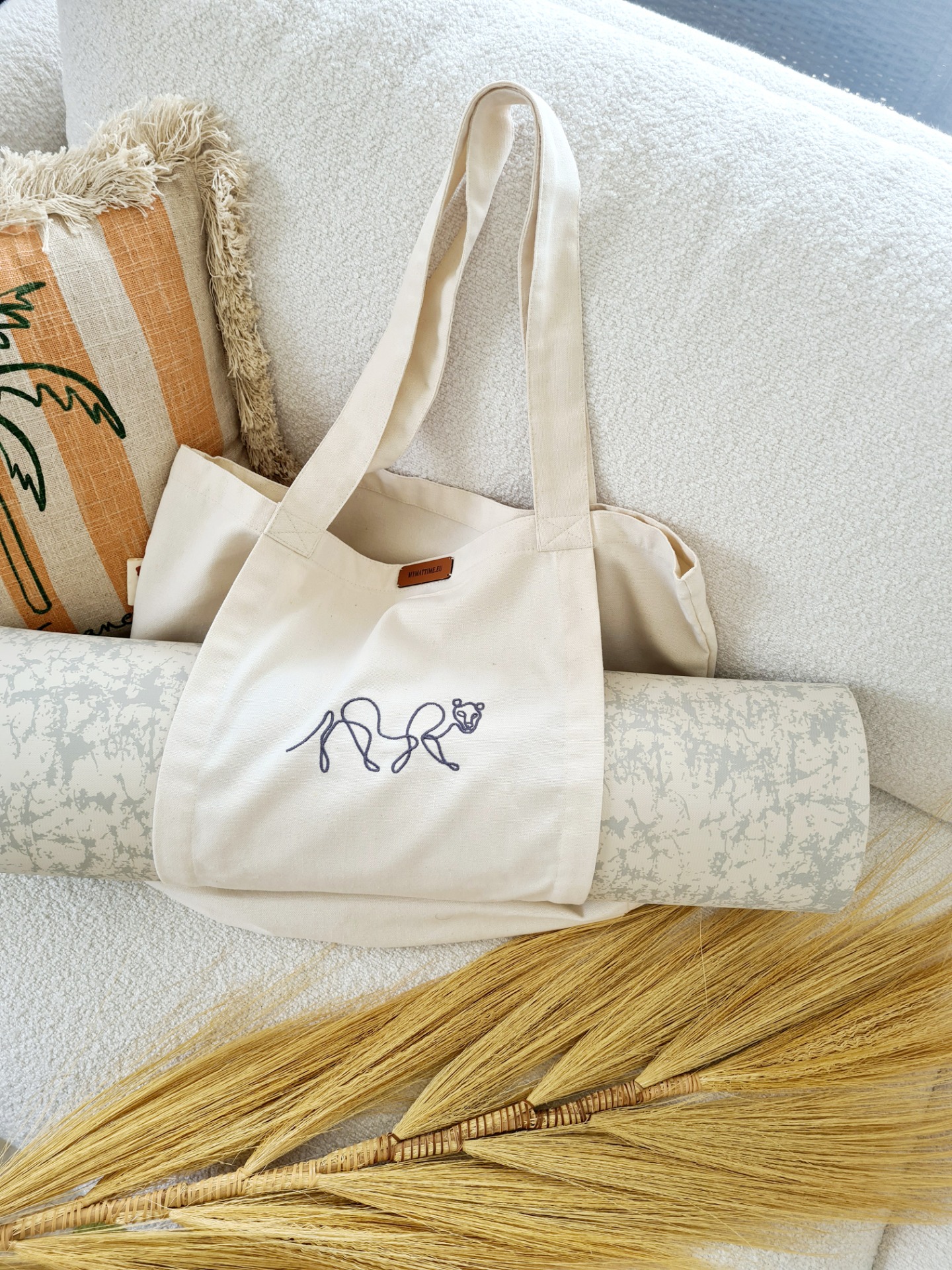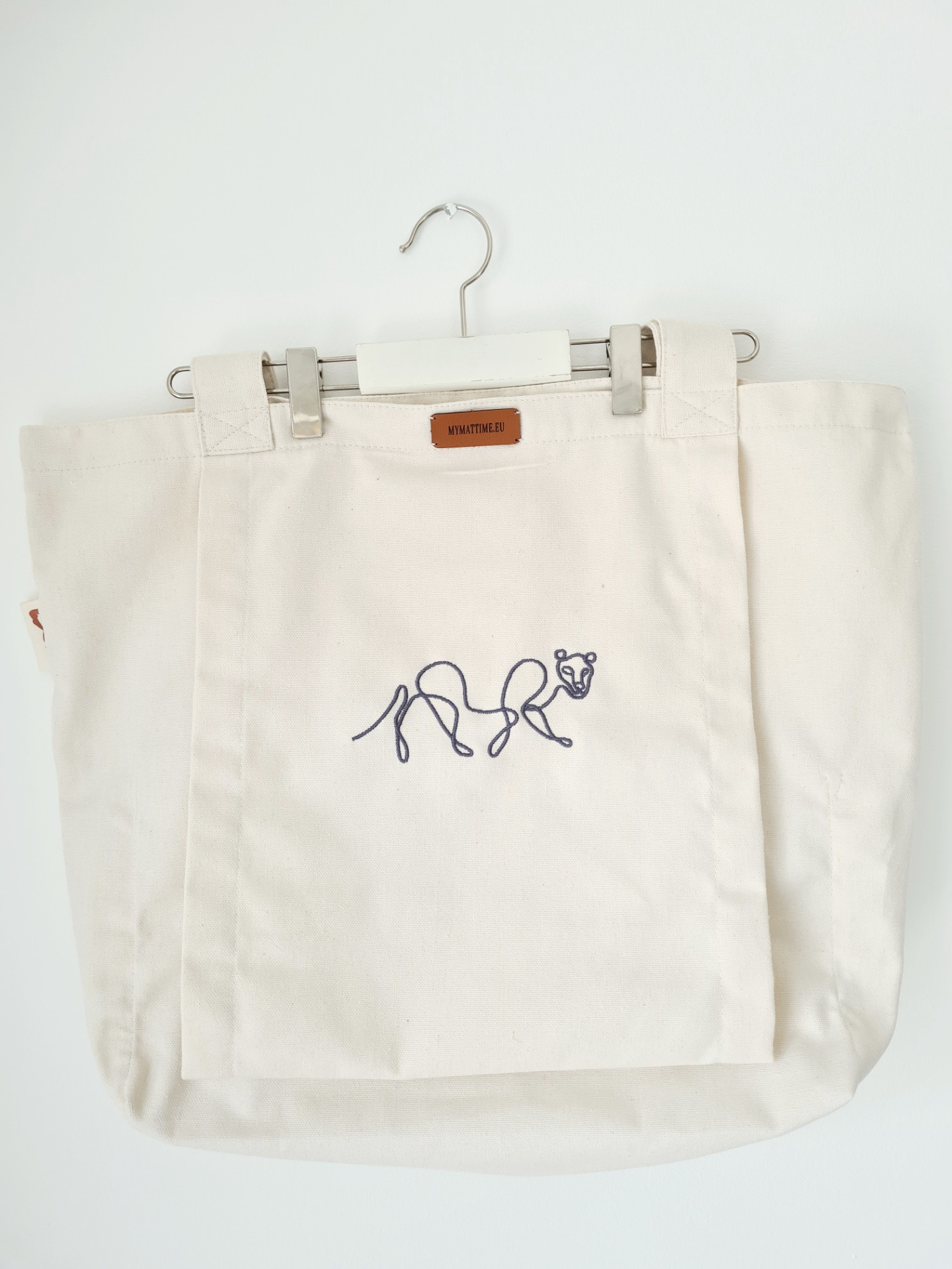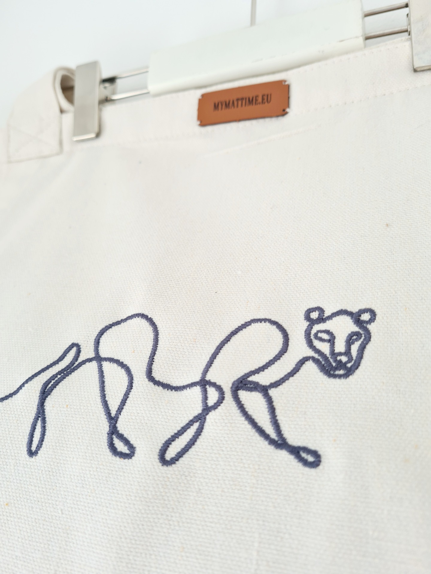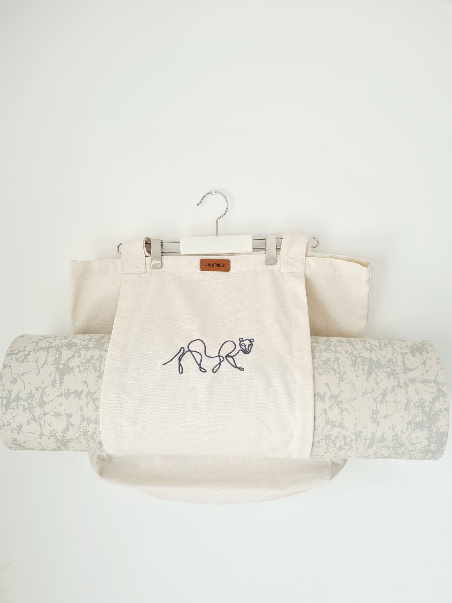 Mymattime vászon jóga, pilates és strandtáska. Nyers fehér színben, szürke leopárd hímzéssel.