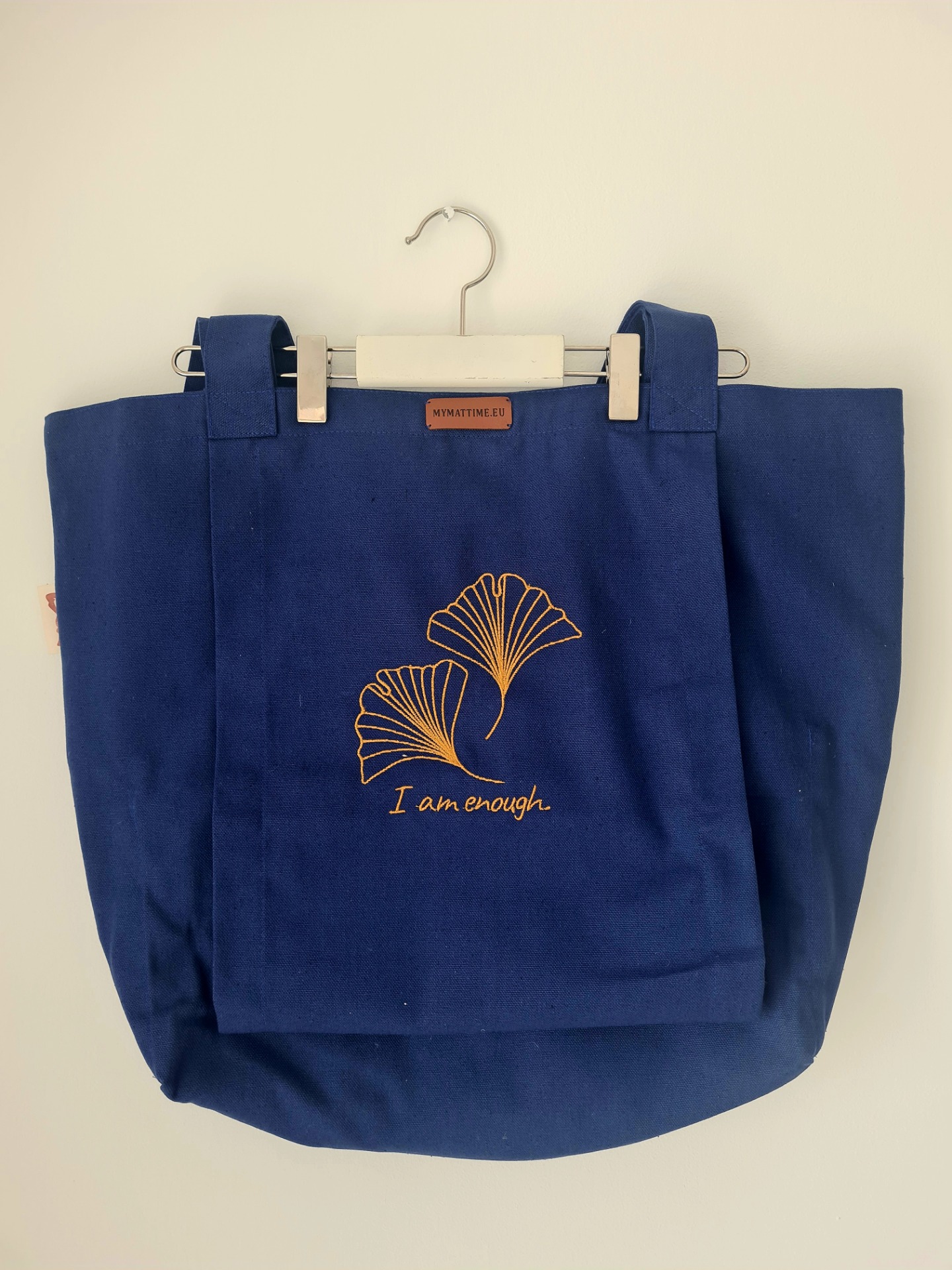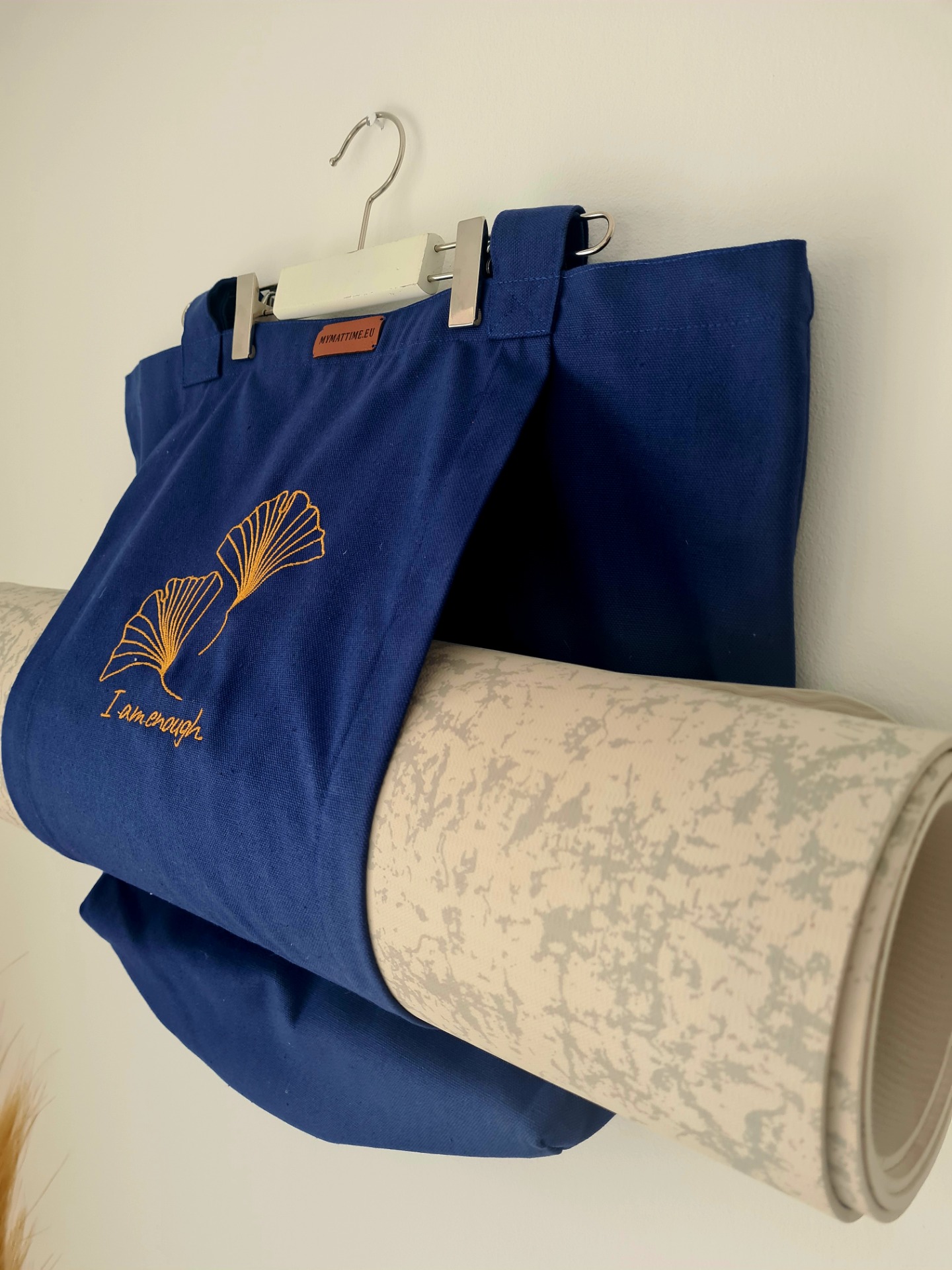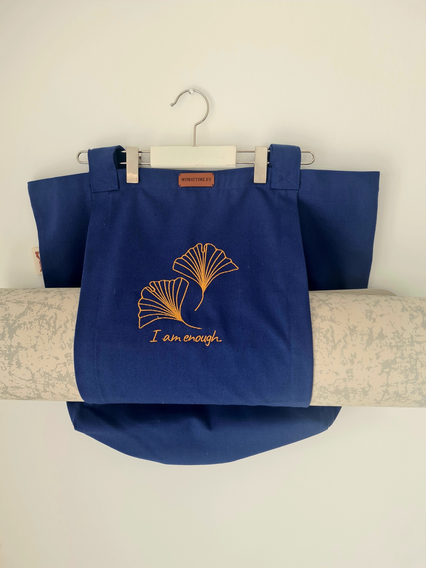 Mymattime vászon jóga, pilates és strandtáska. Azúrkék színben, arany ginko biloba mintával.