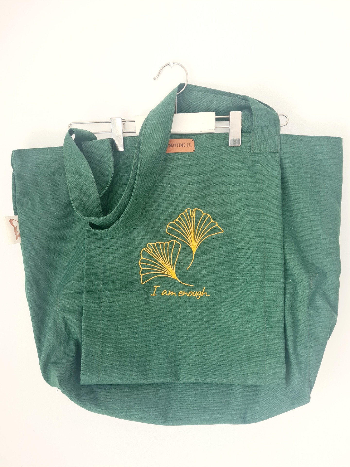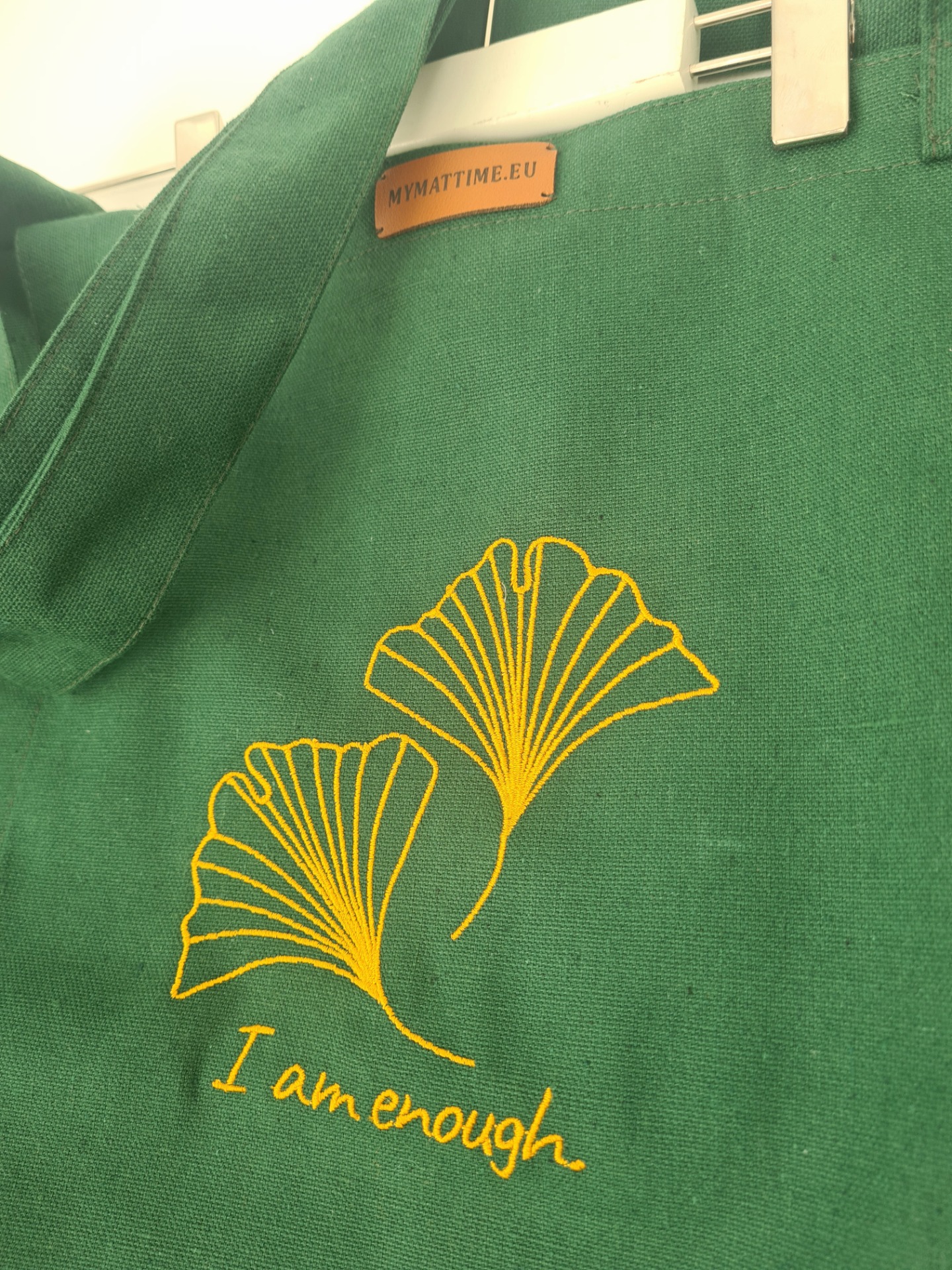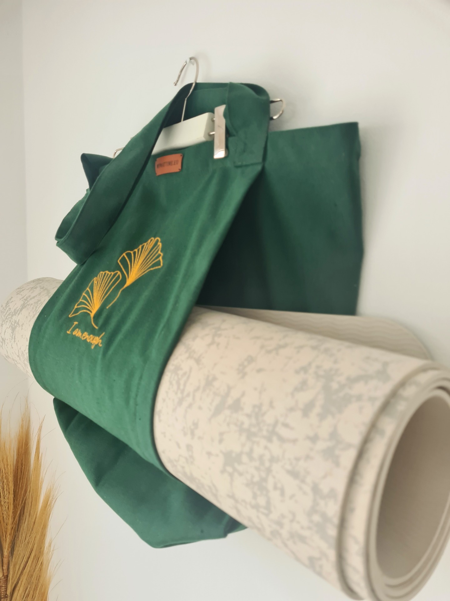 Mymattime vászon jóga, pilates és strandtáska. Olajzöld színben, arany ginko biloba mintával.