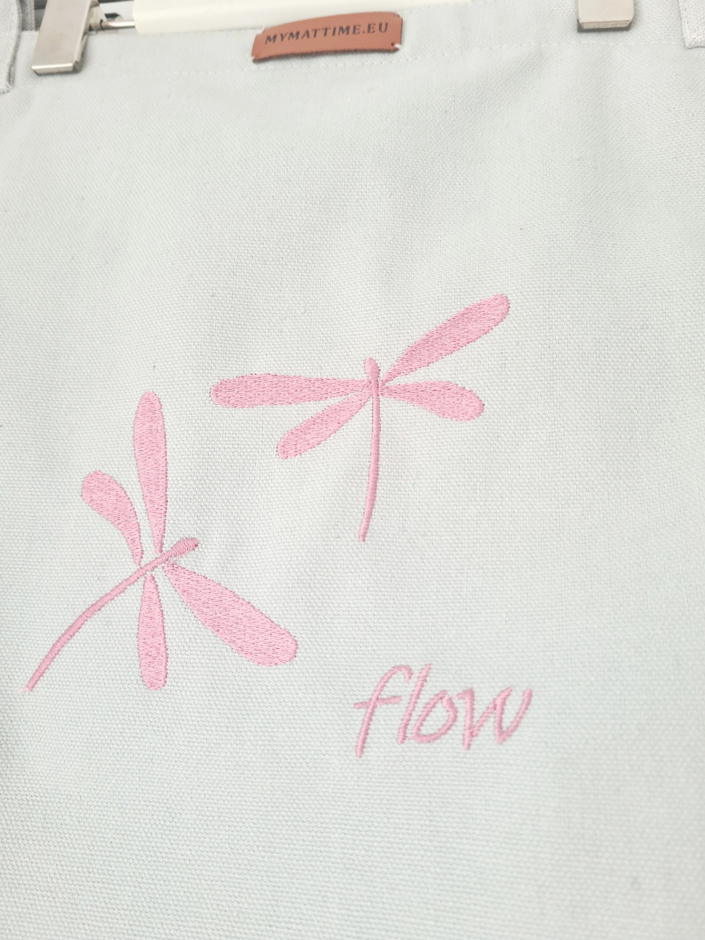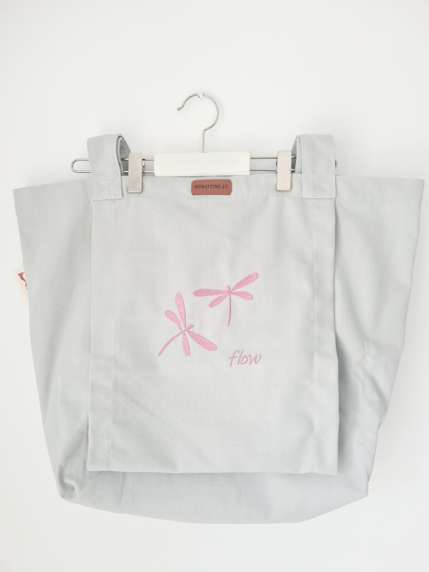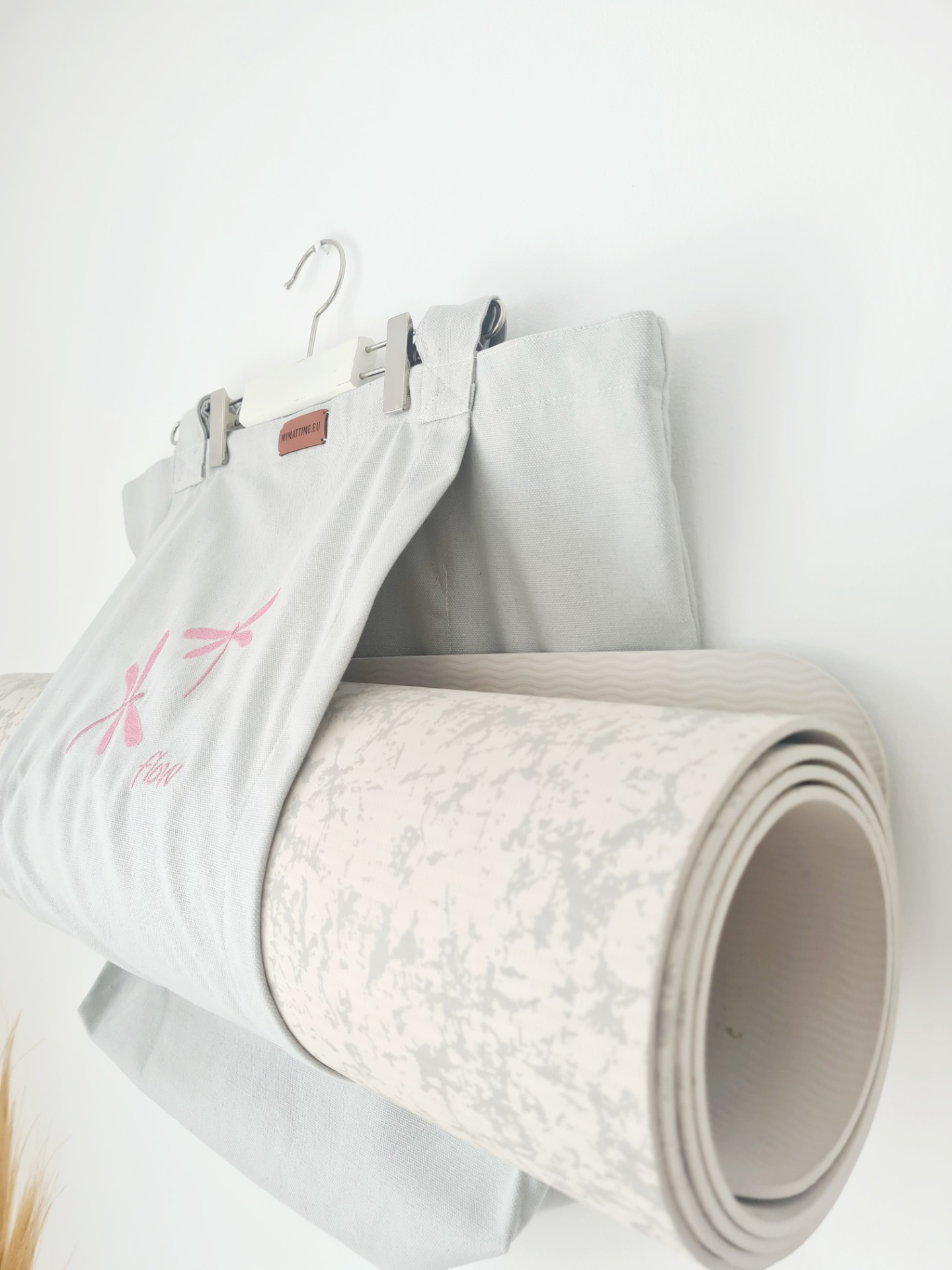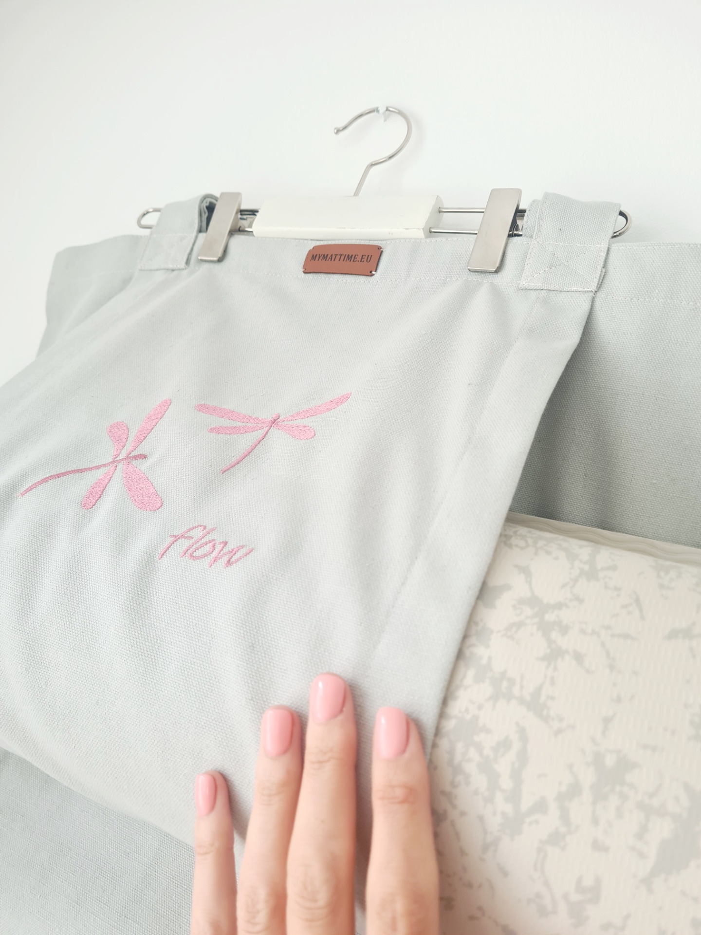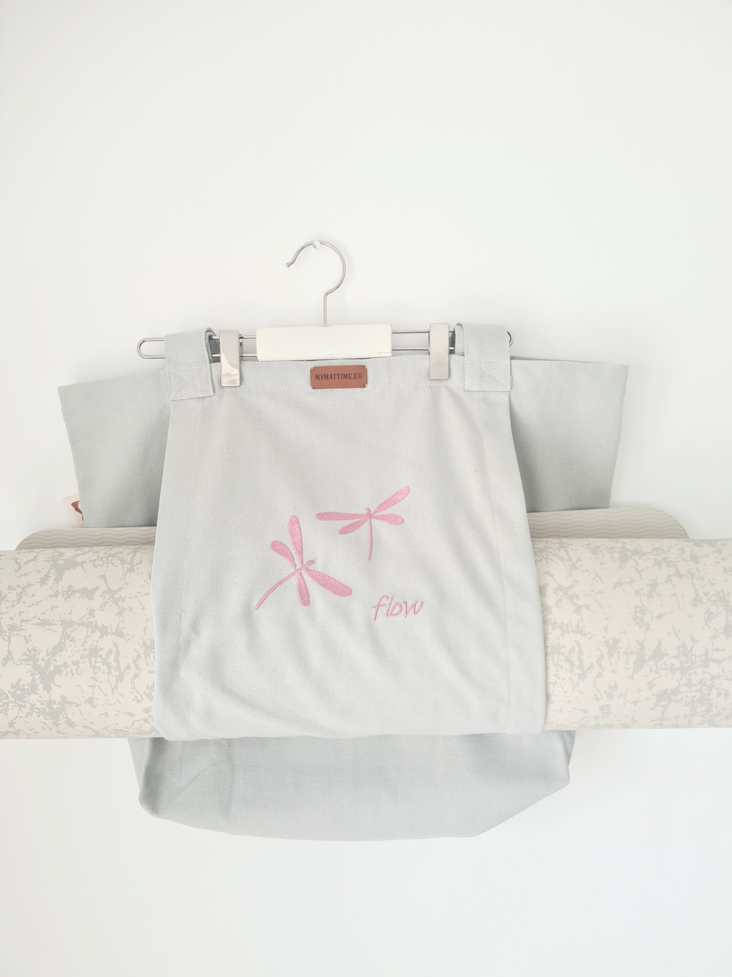 Mymattime vászon jóga, pilates és strandtáska. Szürke színben,Rózsaszín szitaköző hímzéssel, "flow" felirattal.