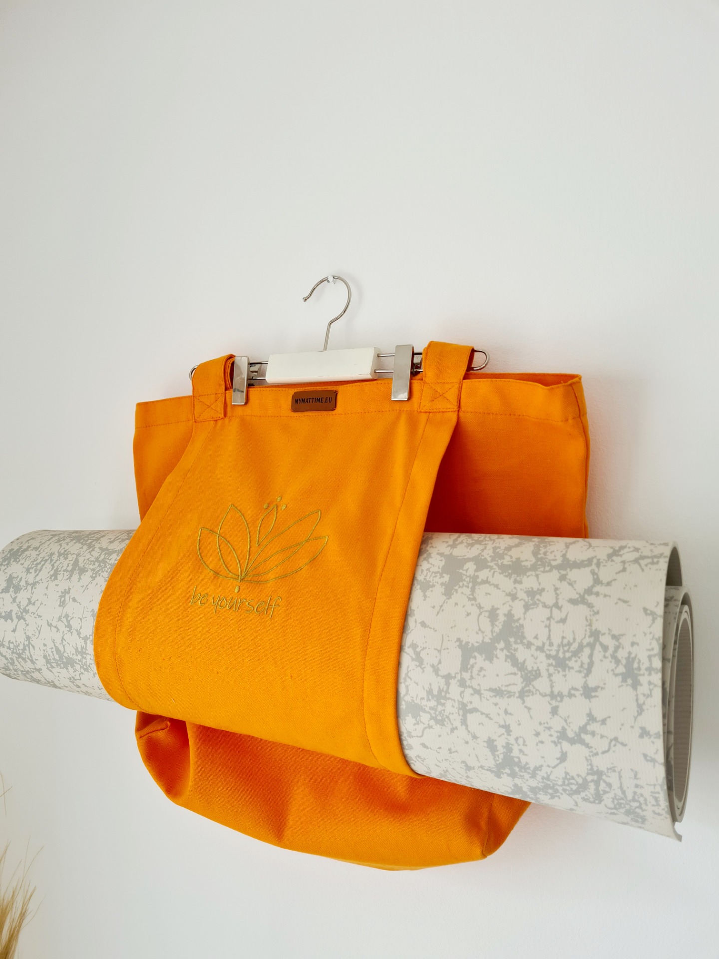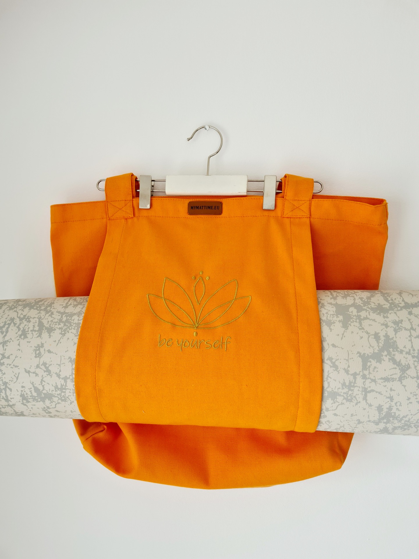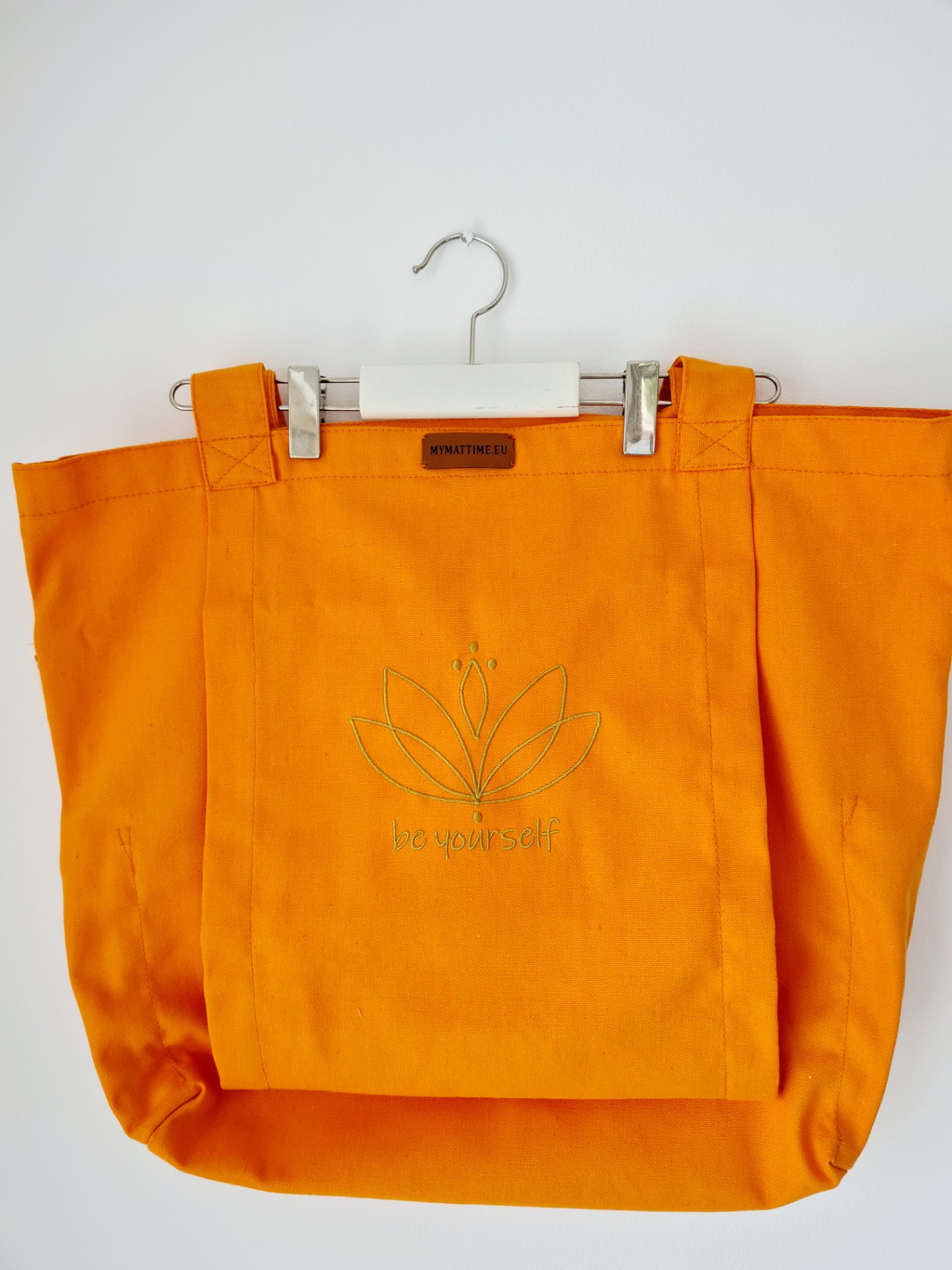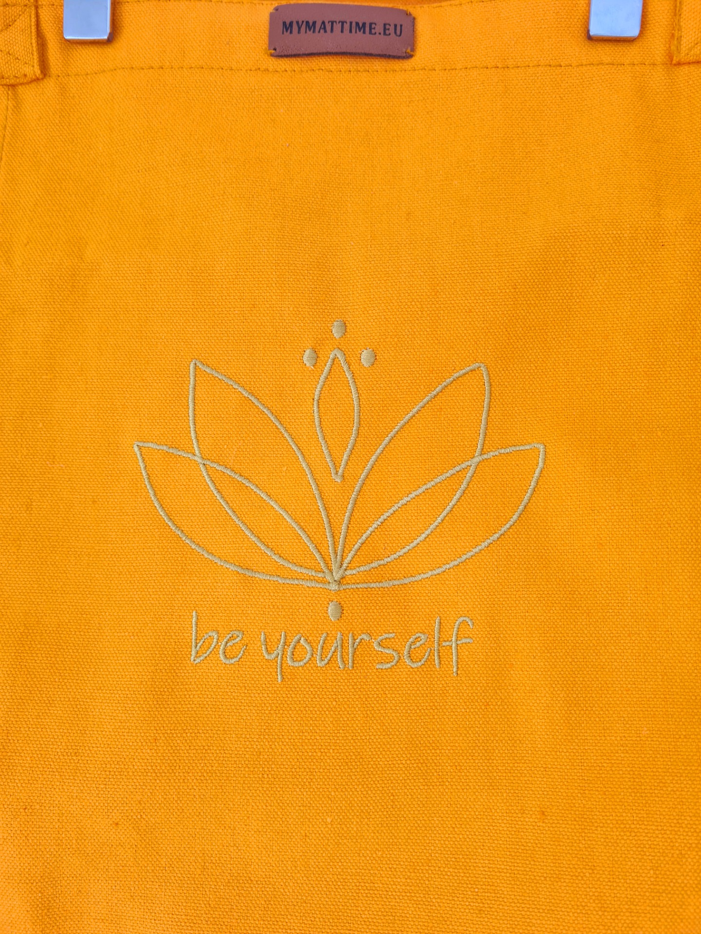 100% Canvas, orange bag with golden lotus motive and "be yourself" embroidered on it.