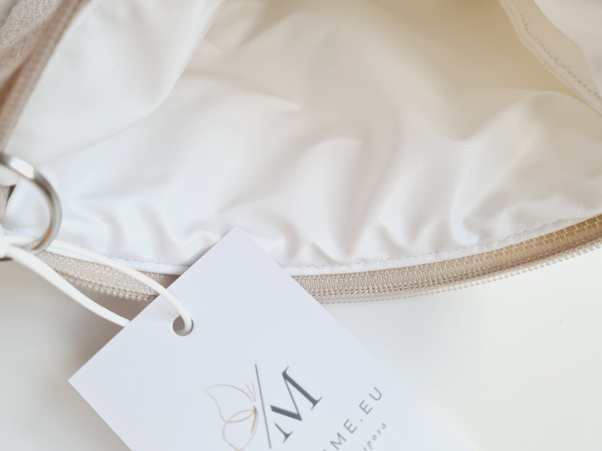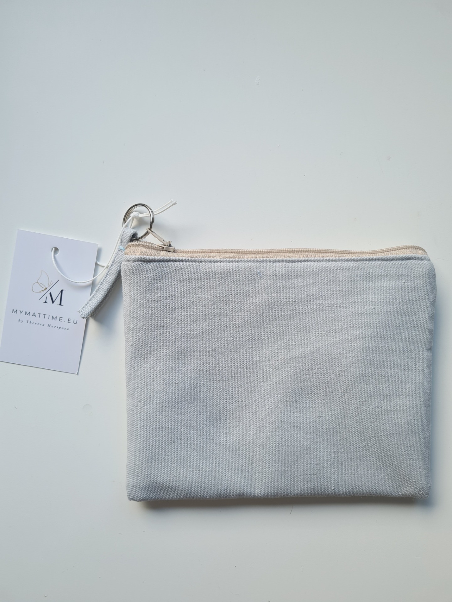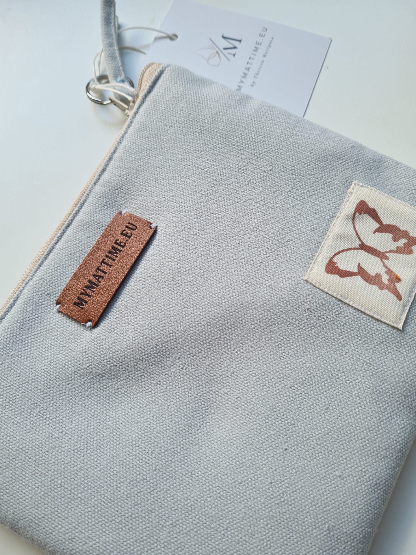 Vízálló neszesszer, sminktáska, tisztálkodótasak, fürdőruha tárolására is alkalmas. Szürke vászon pillangó cimkével a felületén. Mérete: 19,5 cm x 17 cm