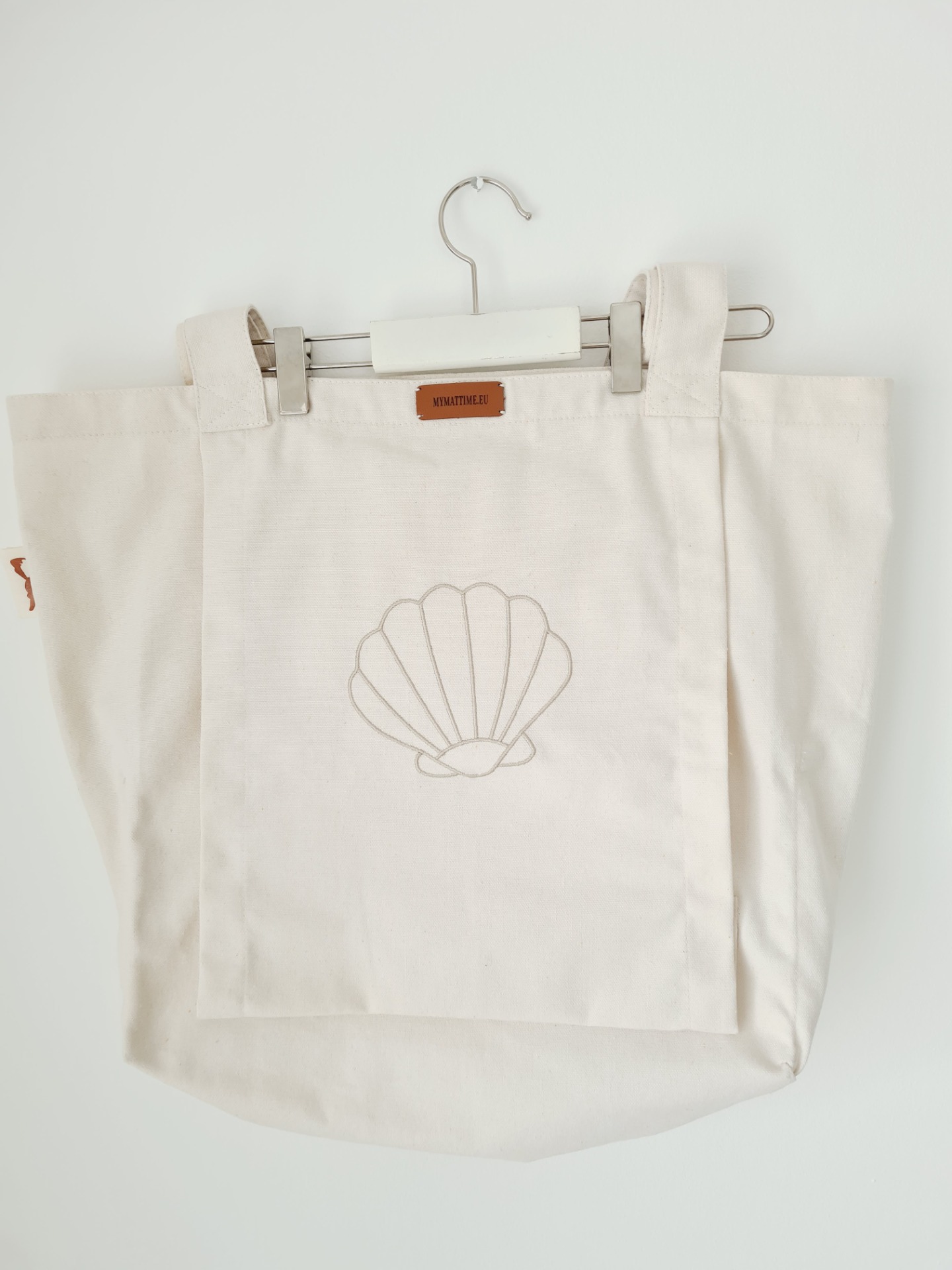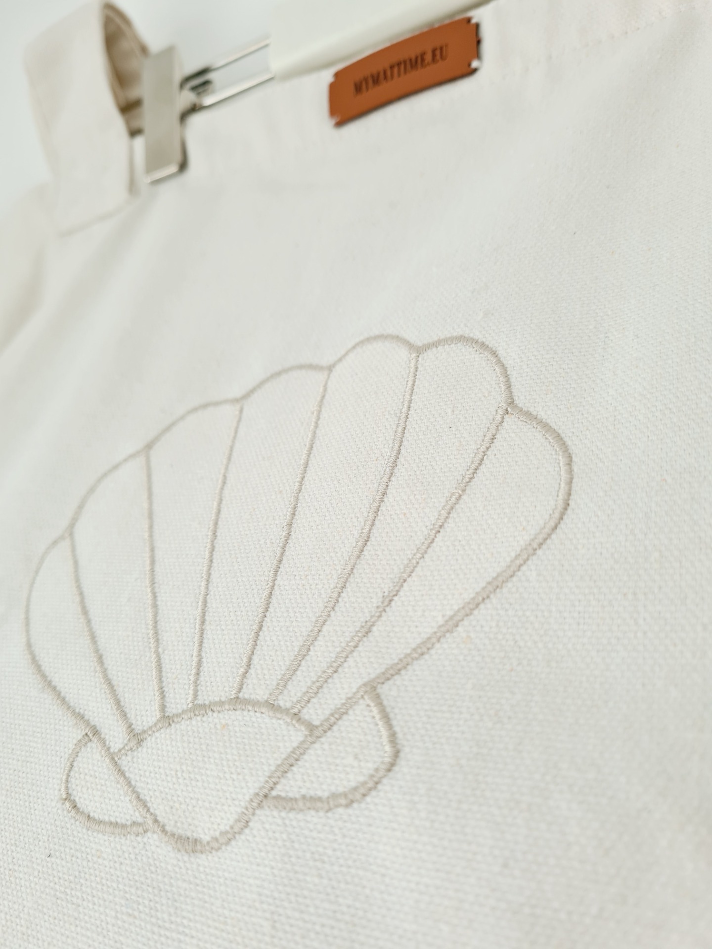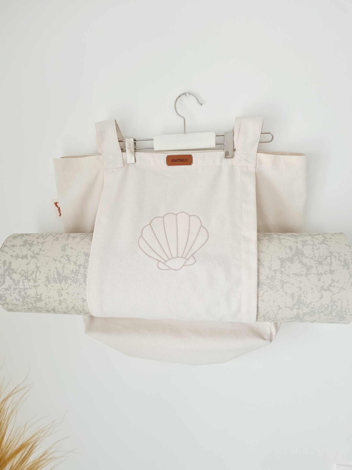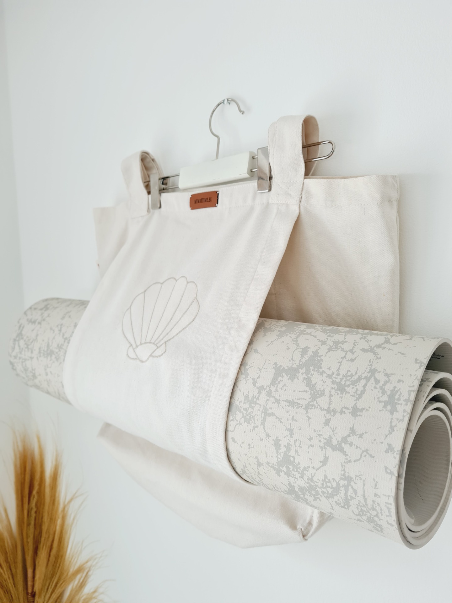 Mymattime vászon jóga, pilates és strandtáska. Nyers fehér színben, kagyló mintával.