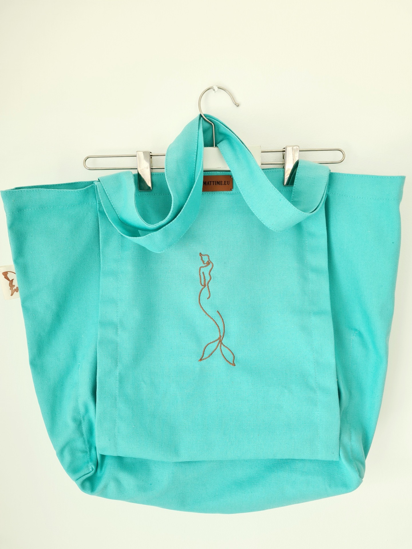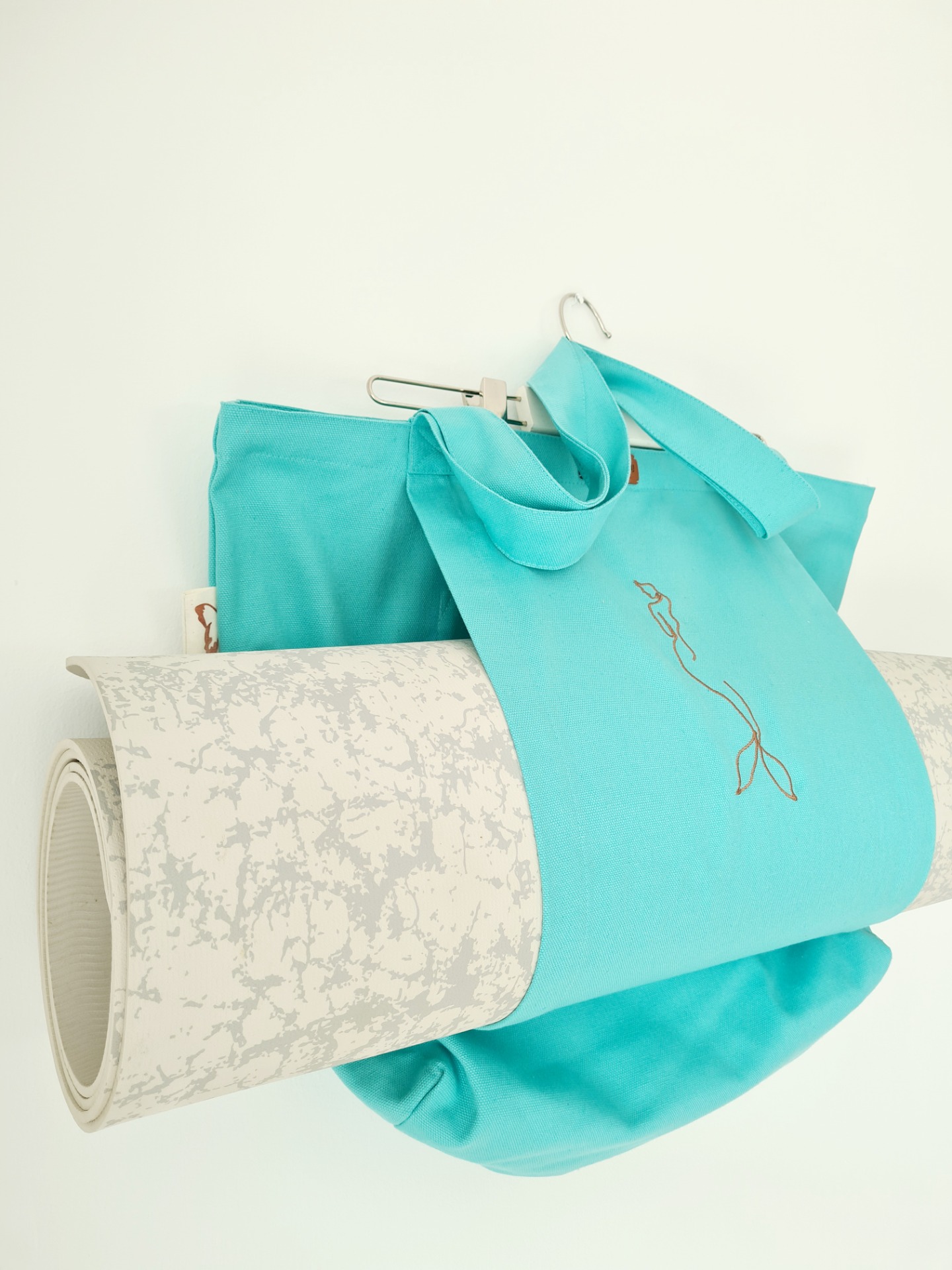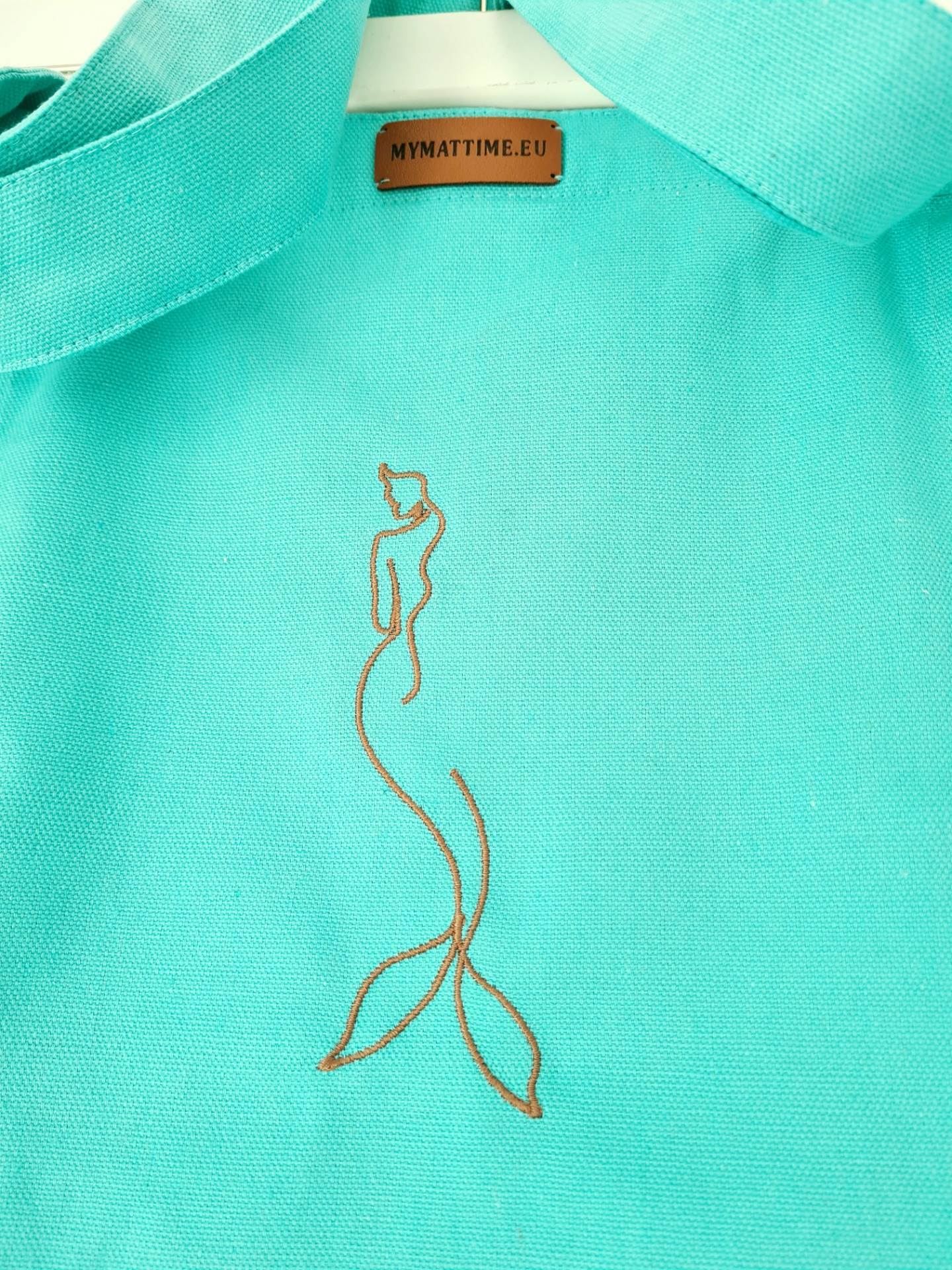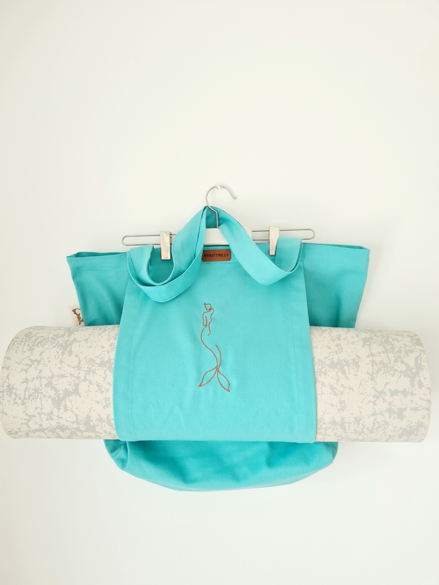 Mymattime vászon jóga, pilates és strandtáska. Türkiz színben, sellő sziluett mintával.